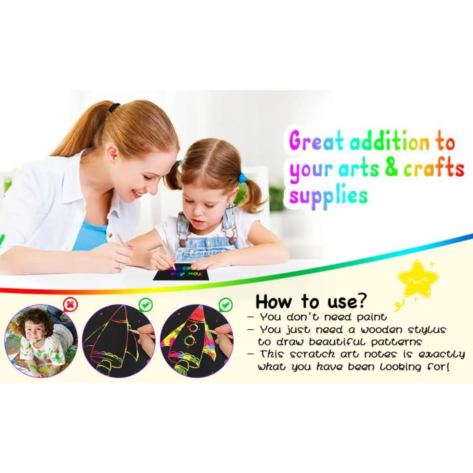 💖Cute & Fun Art Craft Paper - These scratch cards are very fun to play with, Multi-packs and rainbow design effectively cater to boys and girs 3 years old and up, even if you aren't particularly artistic, you'll enjoy scratching off the black surface and seeing the vibrant colors revealed.The scratch paper note help improve parent-child relationships. Scratch pad is a simple way to express love each other, such as mom’s lunchbox note to kids and husband’s love note to wife.