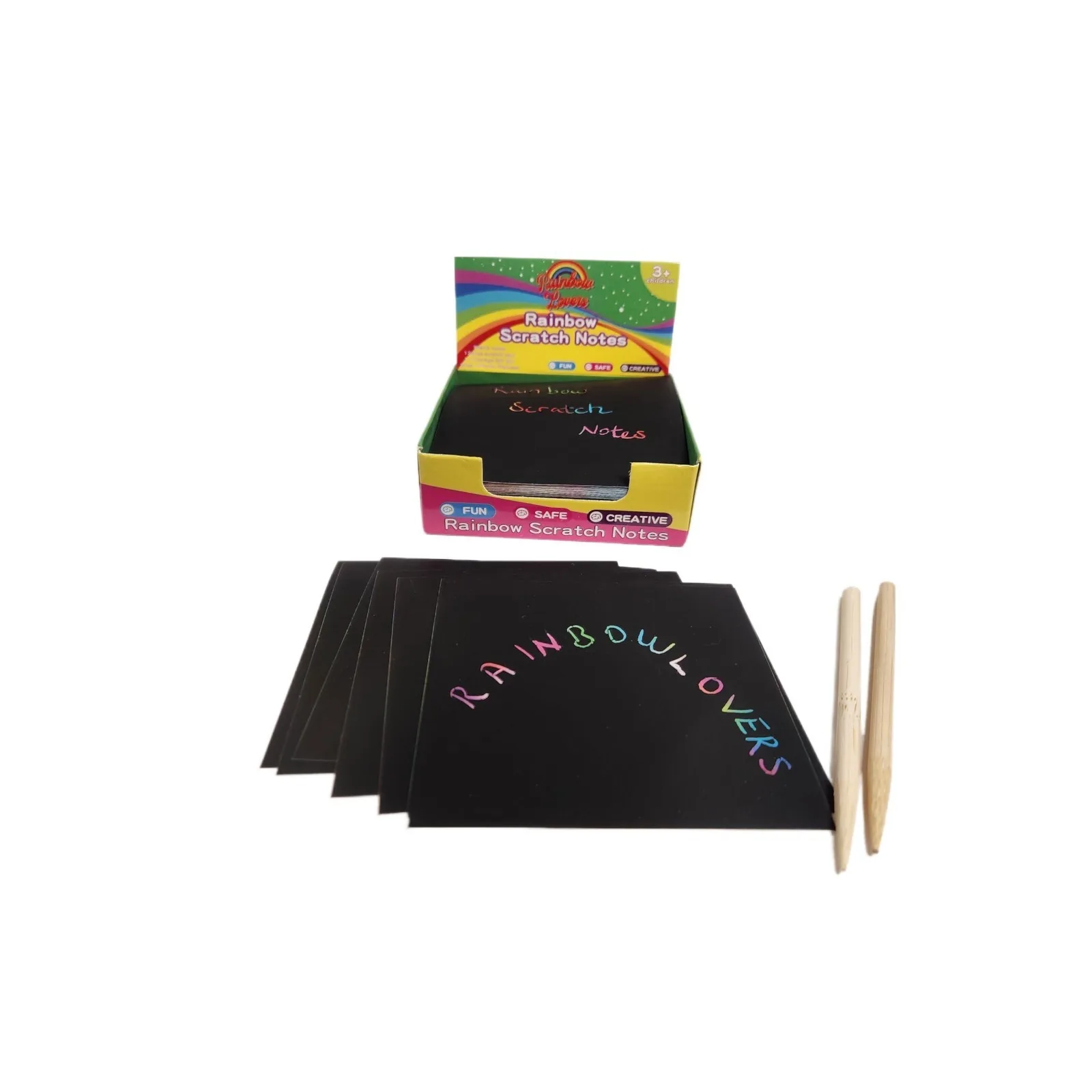 Package includes: 100 pieces of scratch paper + 2 bamboo pens + color box + heat-shrinkable film