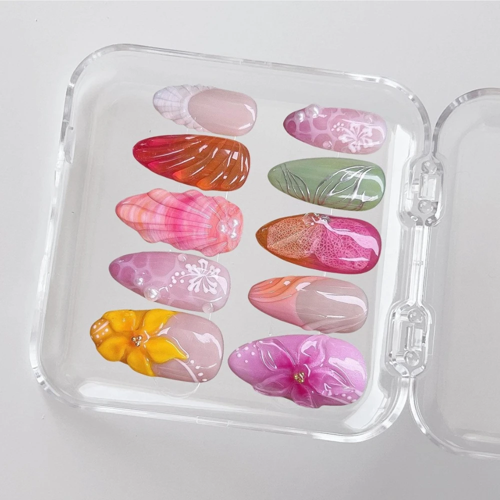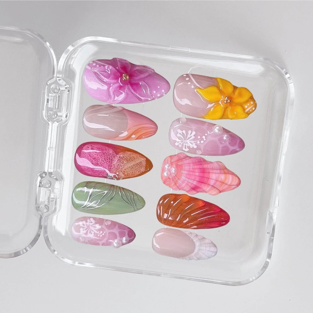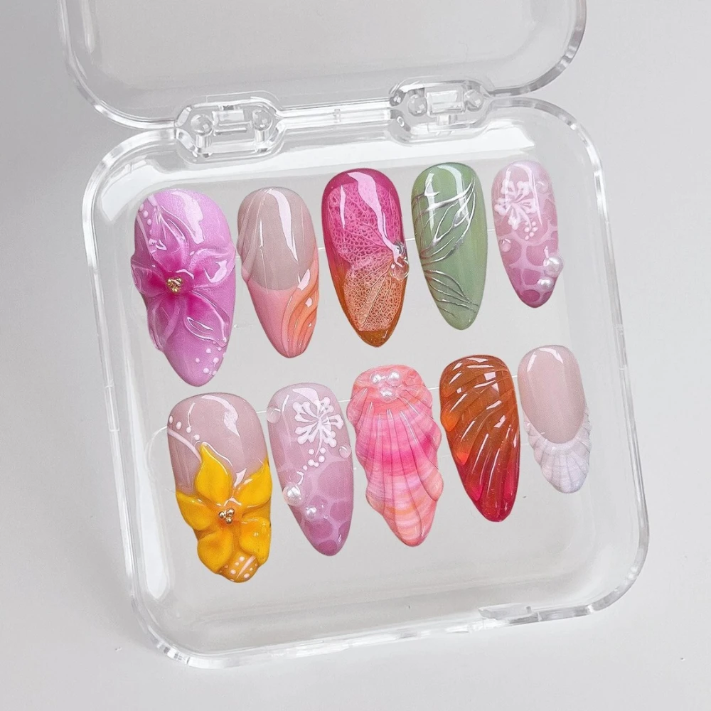 10Pcs Handmade Press On Nails Artificial Full Cover 3D French Flower Style Almond Pattern ABS Material Nail Art Salon with Set