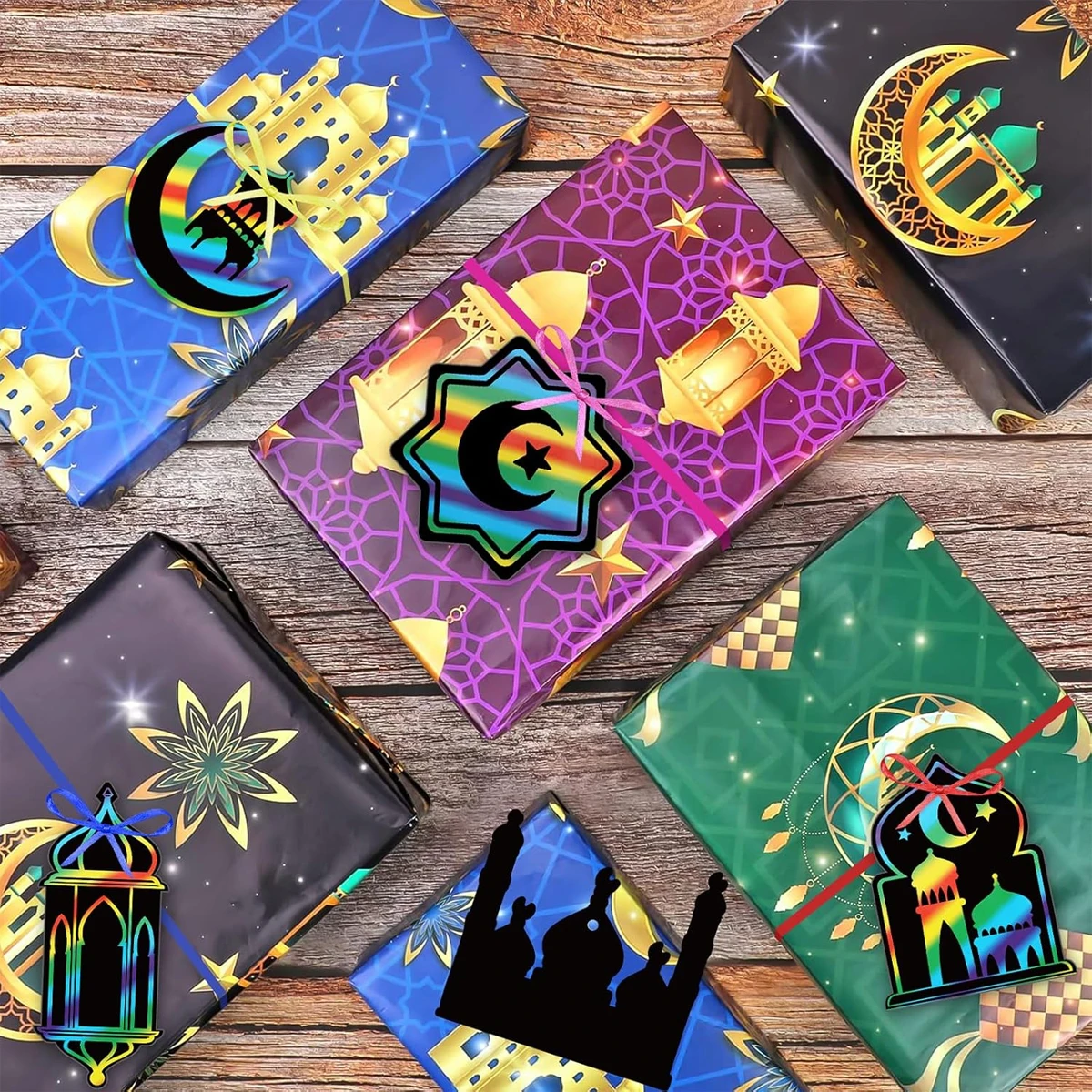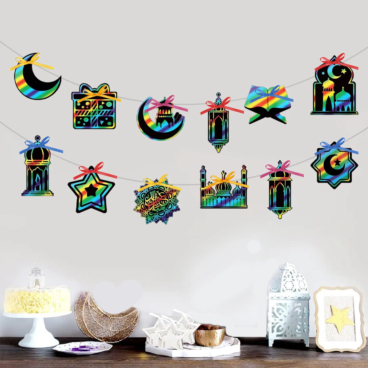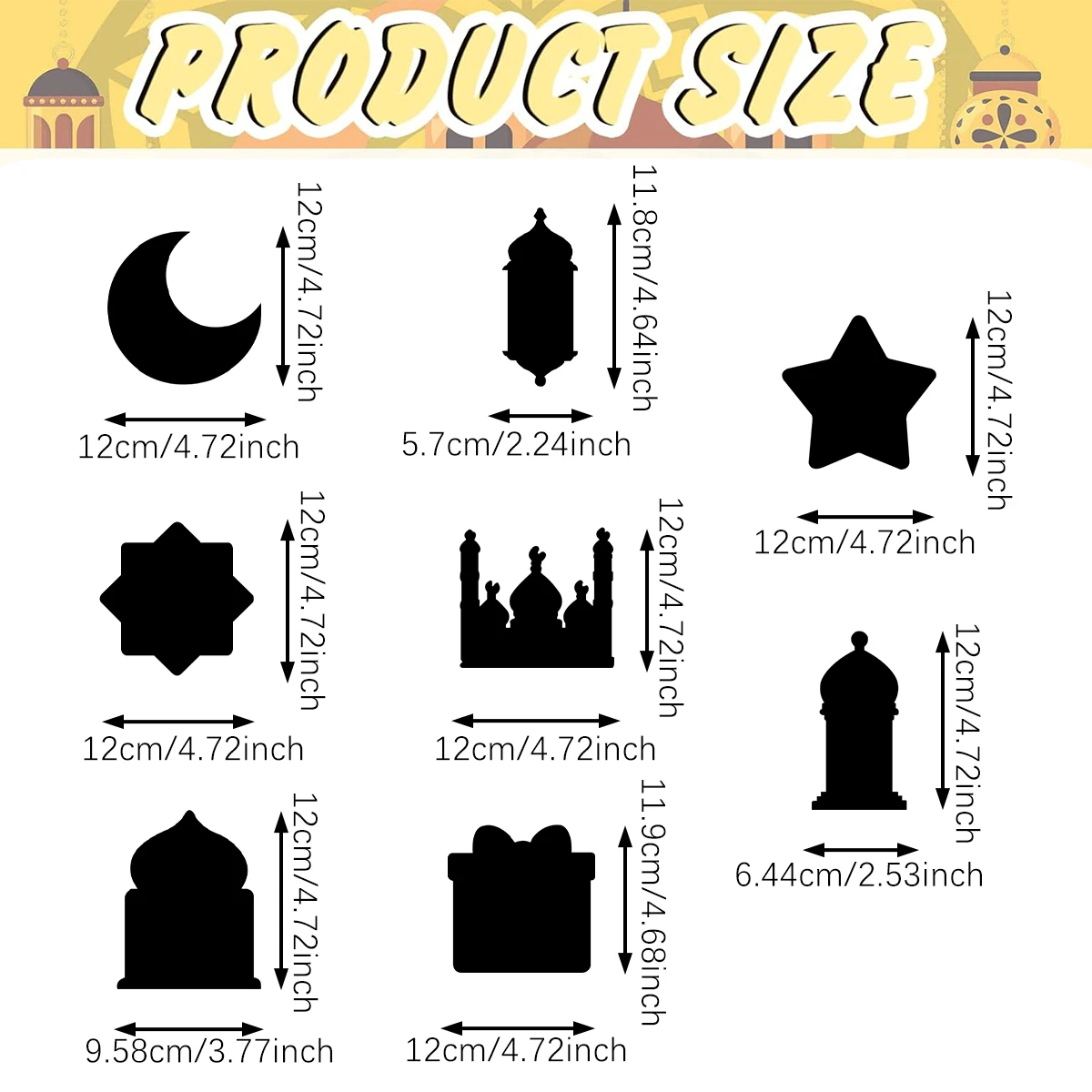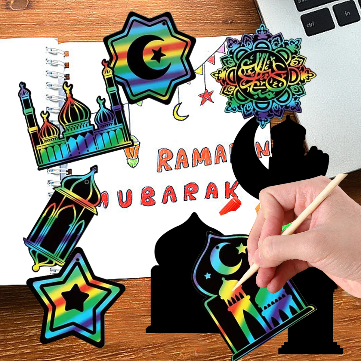 48/96 Pcs Ramadan Scratch Art Kit Rainbow Scratch Paper with Wood Sticks Ribbons Star Moon Lantern Shaped for Eid al-Fitr Party