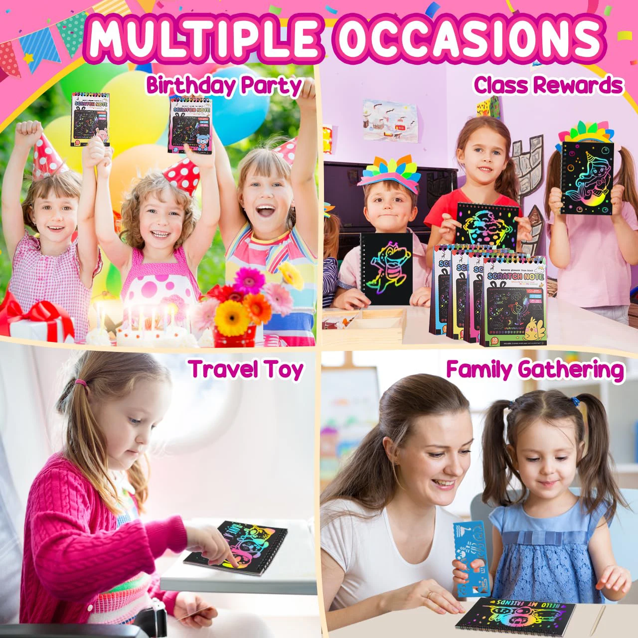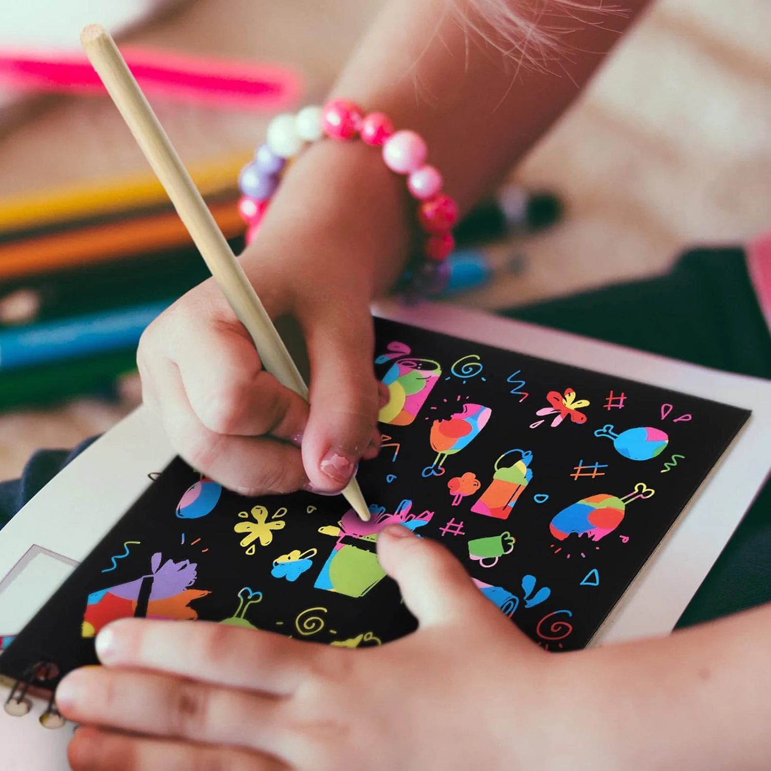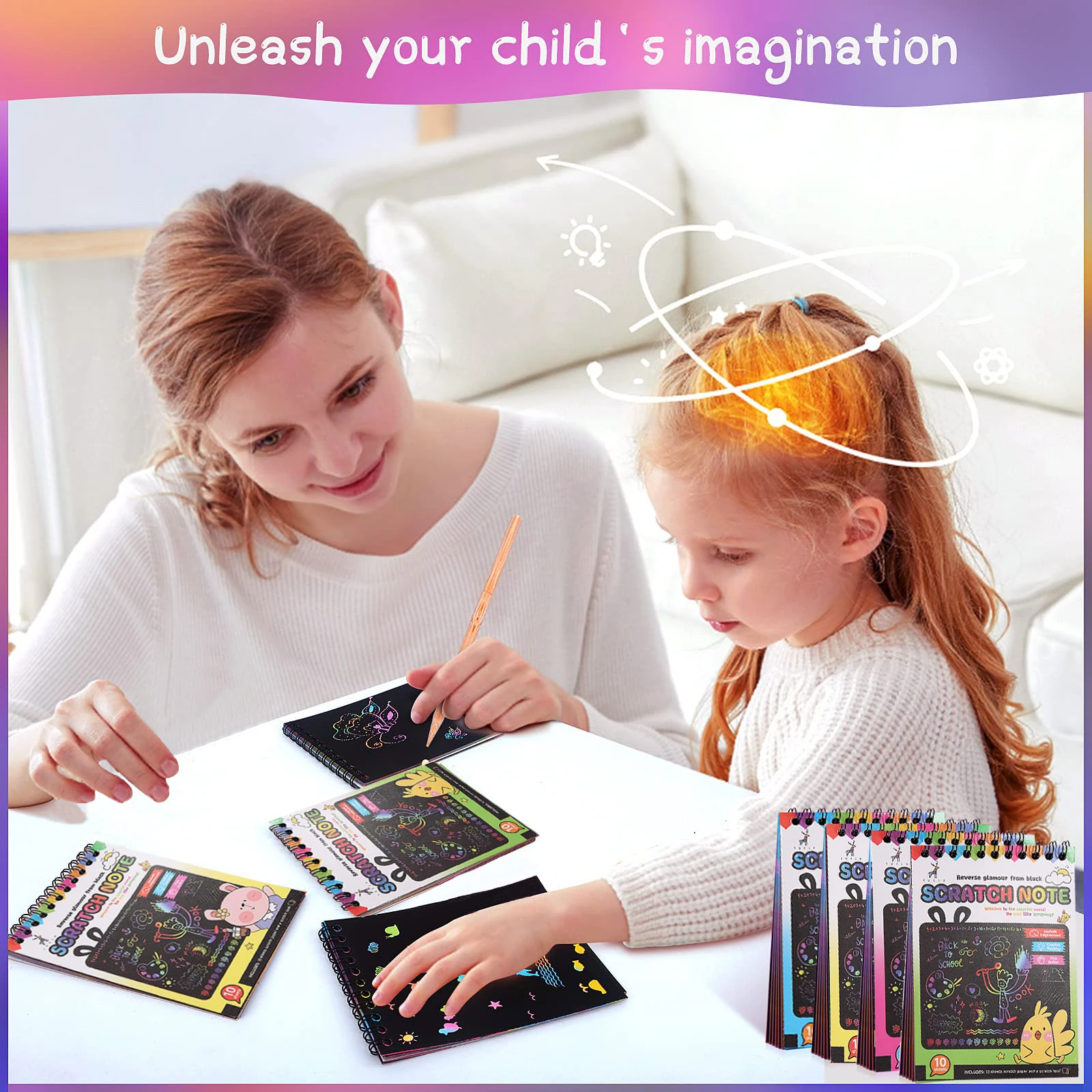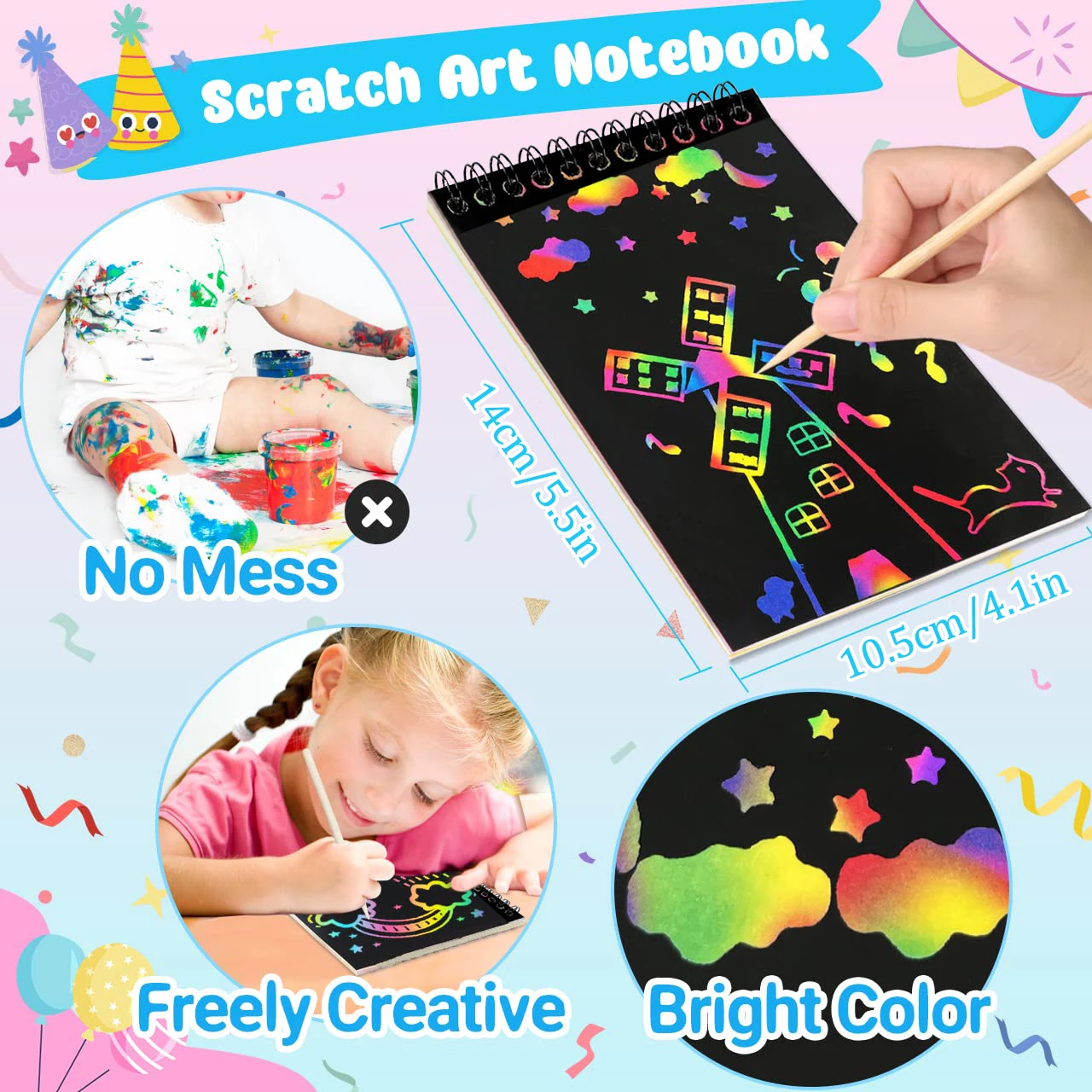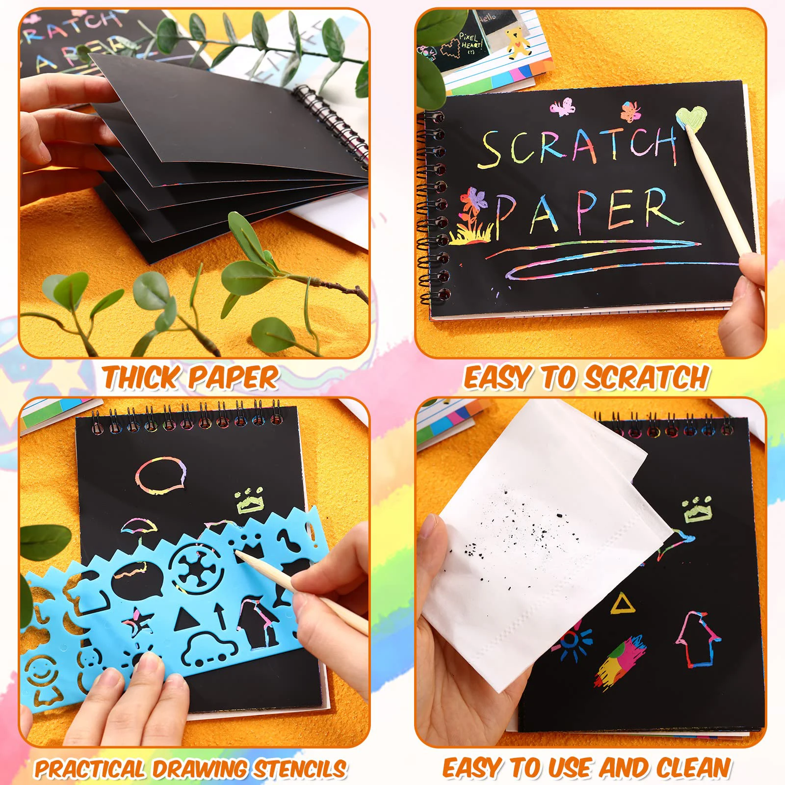 Scratch off art kit supply includes rainbow scribble spiral notepads (4*5.5 inch/14*10.5cm) and wooden stylus! Each scratch notepads has10 sheets.