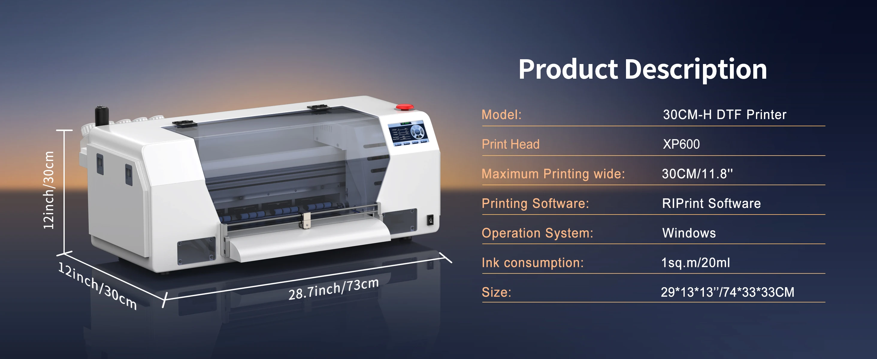 A3 XP600 With Oven:1.A3 30CM-H DTF Printer *1+2.A3 PET Oven *1+3.DTF Ink 5*250ML+3.Hot Melt Powder 1KG+4.DTF PET Roll Film 33*100M*1+6.Printing software *1+7.User Manual*1
