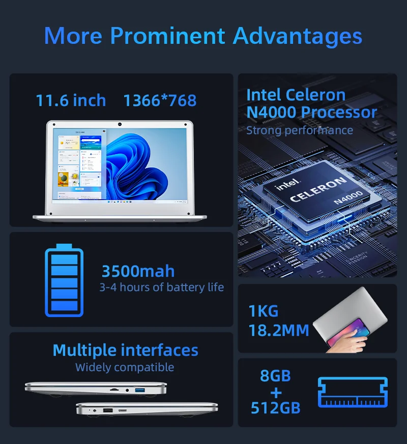 Cheap 11.6-inch Portable Laptop Student Laptops Windows 11 Office Computer Intel Celeron N4000 8G RAM 256GB 3500mAH Notebook